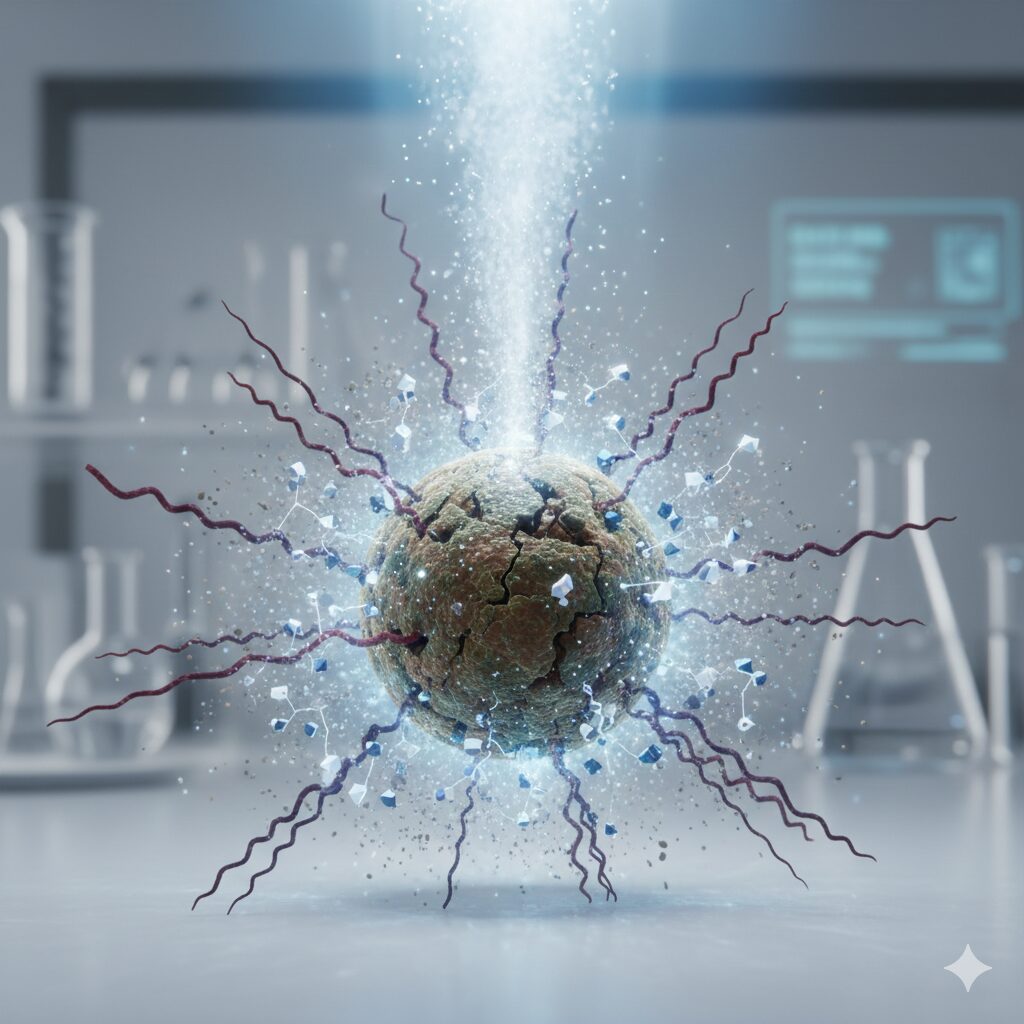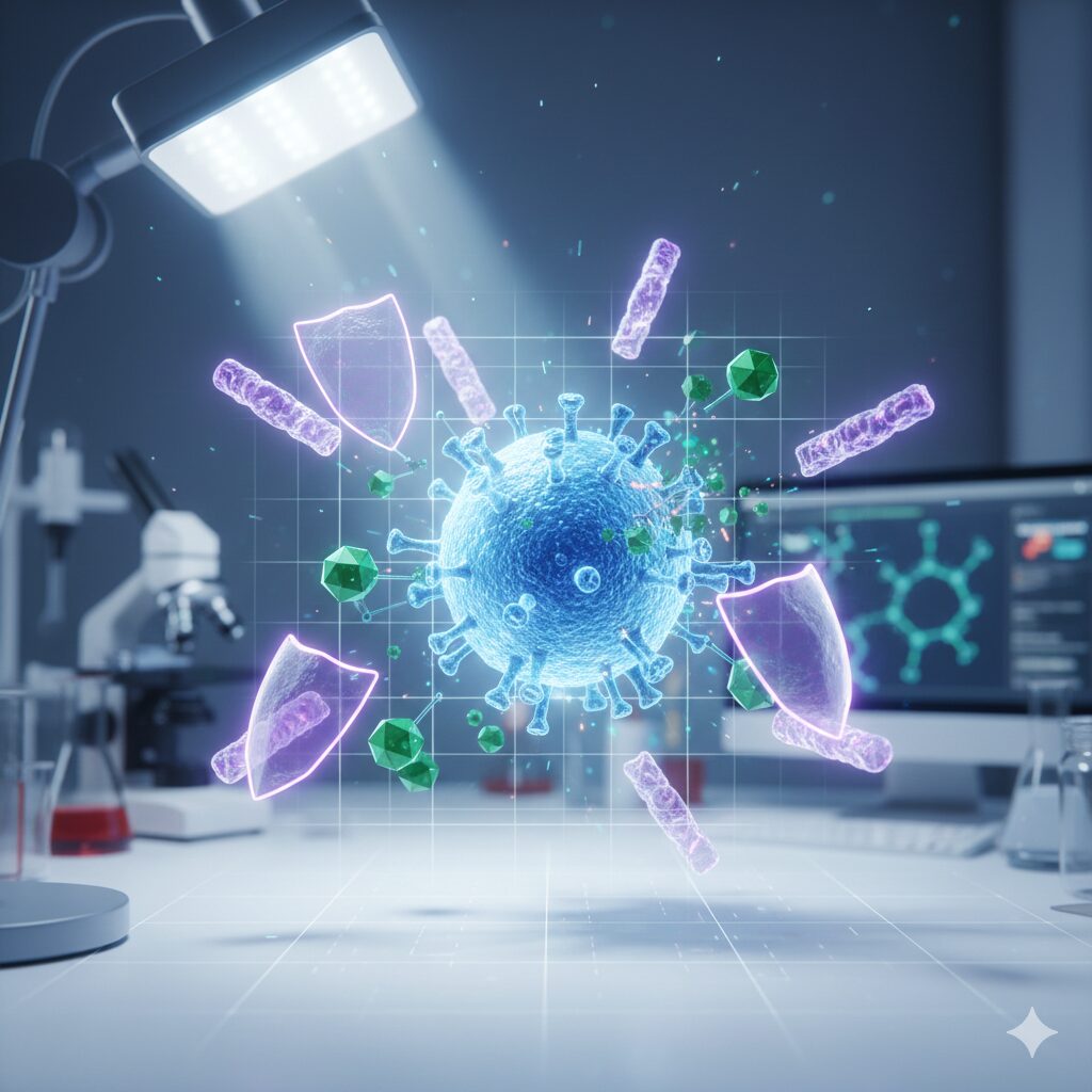 新型コロナウイルスやインフルエンザウイルスは、「エンベロープ」という脂質の膜に包まれています。アルキルグルコシドはこの膜(油分)を素早く分解し、膜を失ったウイルスは細胞に感染する能力を失い不活化します。
